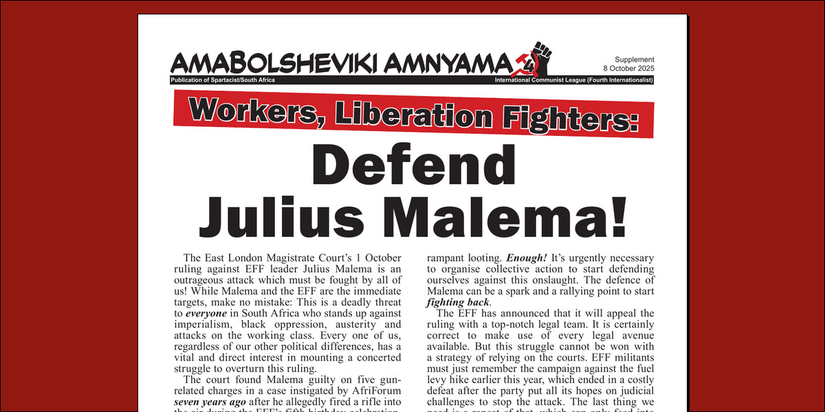 The East London Magistrate Court’s 1 October ruling against EFF leader Julius Malema is an outrageous attack which must be fought by all of us! While Malema and the EFF are the immediate targets, make no mistake: This is a deadly threat to everyone in South Africa who stands up against imperialism, black oppression, austerity and attacks on the working class. Every one of us, regardless of our other political differences, has a vital and direct interest in mounting a concerted struggle to overturn this ruling.