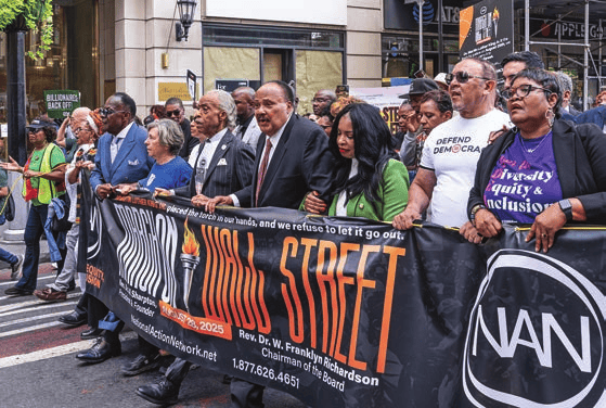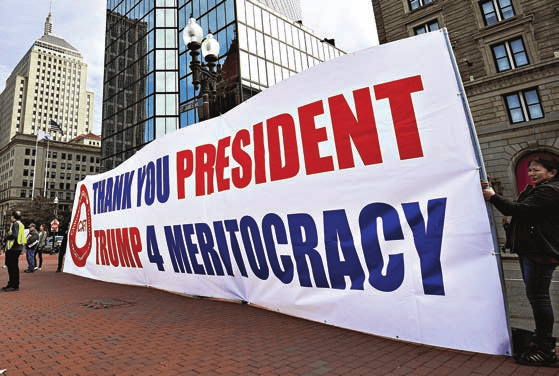 Boston, 2018: Right-wing rally lauding “meritocracy” against Harvard’s admissions practices which consider race (above). Al Sharpton leads “March on Wall Street” to protest Trump’s attacks on DEI, August 2025 (below).