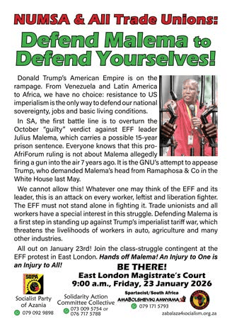 The key to turning defence of Malema into a rallying point for a unified resistance to US imperialism is fusing it with the struggle to defend the masses against the enemy within—the Randlords and their GNU lackeys. Every success in defending the working class against the GNU will help strengthen and unify the forces of resistance to US aggression. And workers have a direct interest in Malema’s defence: standing up to Trump will put them in a better position to defend themselves.